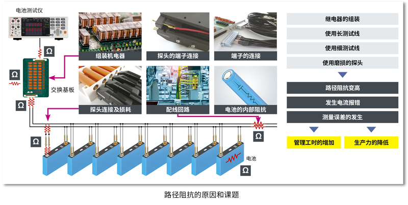 測(cè)量回路阻抗包括在構(gòu)建系統(tǒng)時(shí),所需的電纜與繼電器(測(cè)量多個(gè)電池時(shí)、測(cè)量?jī)x器與電池的連接將自動(dòng)切換)的配線阻抗以及探頭前端磨損所導(dǎo)致的接觸阻抗。這些路徑阻抗如果超過(guò)一定數(shù)值、就會(huì)發(fā)生測(cè)量報(bào)錯(cuò),引起生產(chǎn)線停止運(yùn)轉(zhuǎn)。為了構(gòu)建抑制路徑阻抗的系統(tǒng),需要花成本和時(shí)間、也影響現(xiàn)場(chǎng)作業(yè)。這次大幅改良了容許值,從了減少了路徑阻抗而引起的生產(chǎn)線暫停運(yùn)行的情況以及搭建的工時(shí),并大幅降低了維護(hù)成本。在大型自動(dòng)檢查系統(tǒng)中的表現(xiàn)尤為突出。